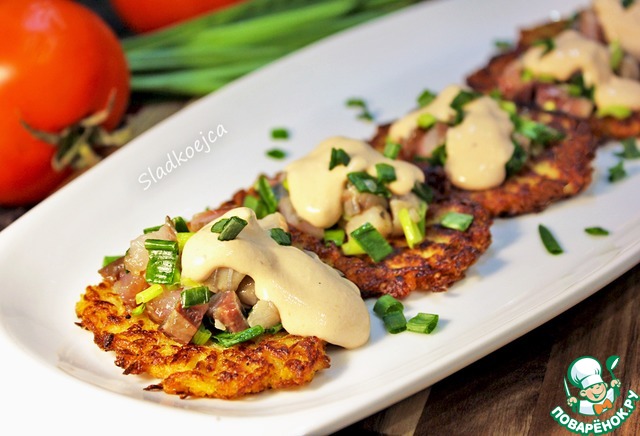 ). Классическое сочетание картошки с селедкой хорошо дополняется соусом, с ним намного вкуснее. PS. Я всё делала по рецепту, но сок из картошки всё-таки отжала, а уже потом добавила сухари. И ещё: у меня закуска получилась немного солоноватой, т.к. я посолила картофельное тесто как обычно для драников, а надо было учесть, что сверху ещё будет соленая селёдка.