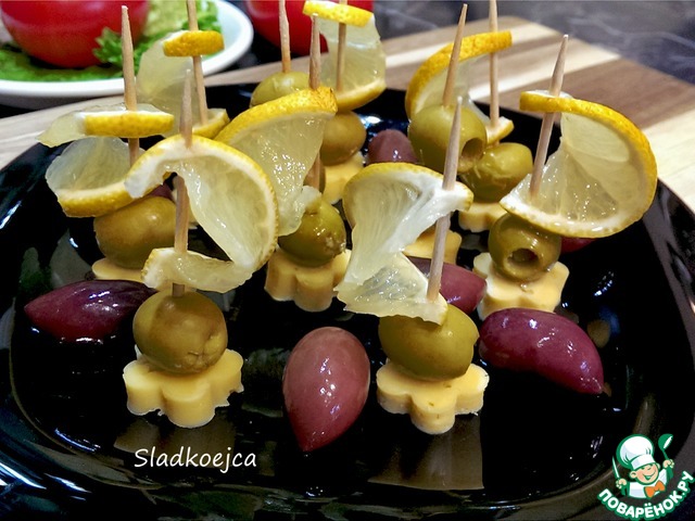 Спасибо за рецепт вкусной и эффектной закуски! Пошла на «ура»! Маленький совет для тех, кто будет делать впервые: начинать сборку удобно с лимона. А чтобы долька хорошо держалась на шпажке, надо проколоть лимон через белый слой под корочкой.