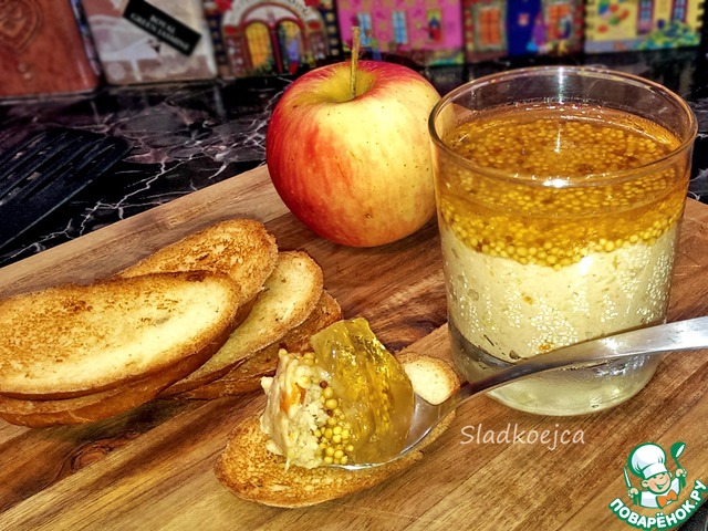 Нежный рийет, интересно дополнен яблочным желе. Очень понравилось добавление зернистой горчицы, она придает особую пикантность. Вкусная и красивая закуска, отлично смотрится на столе.