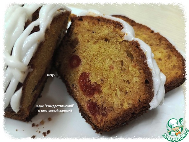 Готовила точно по рецепту. Добавила сухофрукты в сиропе, поэтому немного уменьшила количество сахара. Выпекала 1 час при 180 градусах. Вместо сметанной заливки украсила взбитым с пудрой белком. Получилось вкусно.
