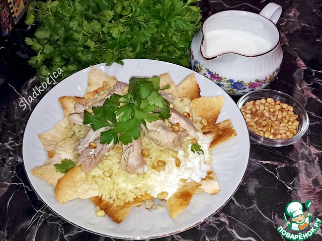 Было вкусно, хотя и необычно для нас. Кедровые орешки очень к месту, понравился соус (кефир, зелень, чеснок, лимон). Он придает пикантность и сочность, в общем-то, сухому блюду. Все сделала по рецепту, только вместо питы взяла лаваш, который поджарила на масле. Большое спасибо автору за интересный рецепт!