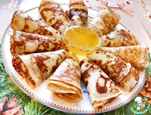 Великолепные получились блины! Очень вкусные, нежные! В меру сладкие, что очень радует. Так как можно есть с медом (что я и делала) или с вареньем.
