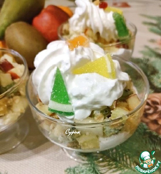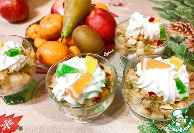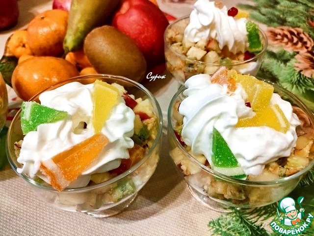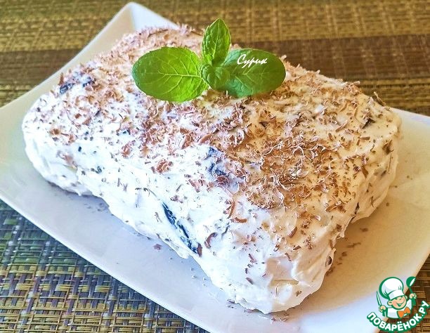 Необыкновенно вкусный десерт! Нежный! Я добавила сахарную пудру, можно было уменьшить количество. Это в следующий раз, который обязательно будет! Сверху посыпала тертым шоколадом. Использовала сливки 38 %. Отличный получился крем, густой. Чернослив и курагу нарезала, т.к. крупные были. Мы в восторге от десерта! А готовить очень и очень быстро!