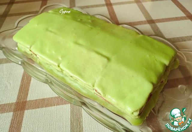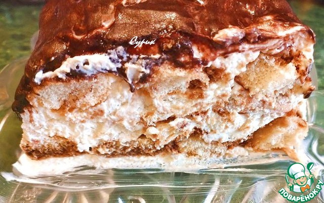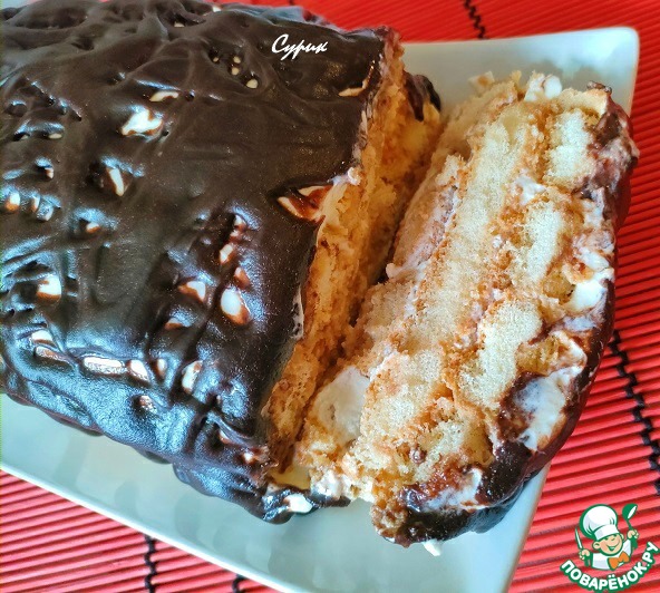 Вкусный получился торт! Особенно сейчас, когда не хочется включать духовку, рецепт как раз и пригодился. Всё по рецепту, за исключением крема сверху. Не стала делать крем, а приготовила глазурь из пакетика. Вкусно! Быстро и просто! Но, потом я поняла, что можно и ещё быстрее было приготовить, купив творожную массу с изюмом и шоколадную. Идея понравилась!