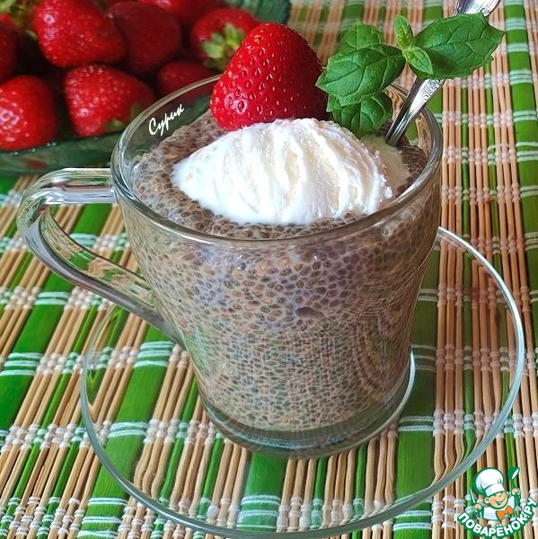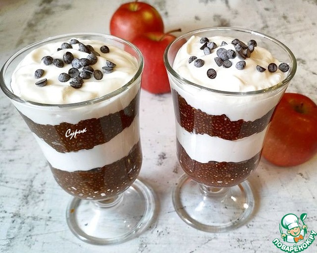 Великолепный десерт! Нам очень понравился! Всё по рецепту сделала. Сверху посыпала шоколадными каплями. А ещё я поэкспериментировала потом (осталась масса – кофейные семена чиа) – полила кокосовым сиропом, а ещё шоколадным топпингом. Тоже очень вкусно!