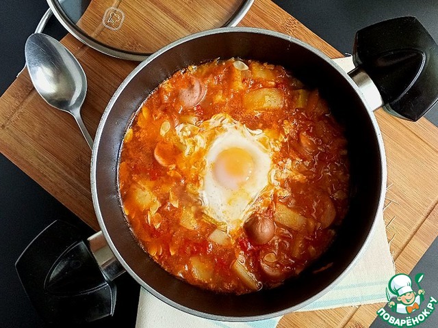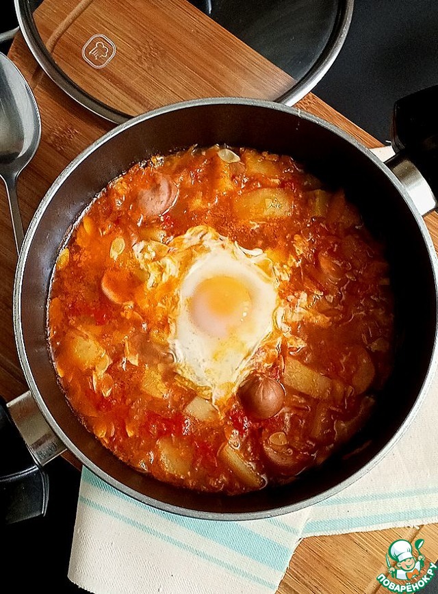 Замечательный рецепт! Всё просто, бюджетно и очень вкусно! Рецепт прямо для данного сезона, когда много свежих и молодых овощей. У меня помидор был крупный и очень красный. Кожицу с него я сняла. Поэтому цвет блюда такой яркий. Никаких пасты и соусов томатных я не добавляла. Следуя советам автора, я положила в блюдо и картофель, и яйцо. Спасибо большое за рецепт. Буду делать периодически. Это можно сказать, что диетическое блюдо по приготовлению. Сосиски я брала "Докторские".