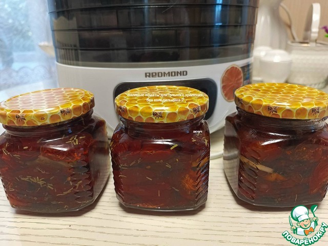 Поздно нашла свой отчет по ранее приготовленным вяленым помидорам (по другому рецепту). Но вновь пришла к выводу, что лучше резать даже небольшие помидорчики вдоль на 3-4 части. Так быстрее они подвялятся. И мякоть я не удаляла. И снова я готовила в электросушилке. Получилось 3 баночки! Как же хочется побыстрее продегустировать!!!