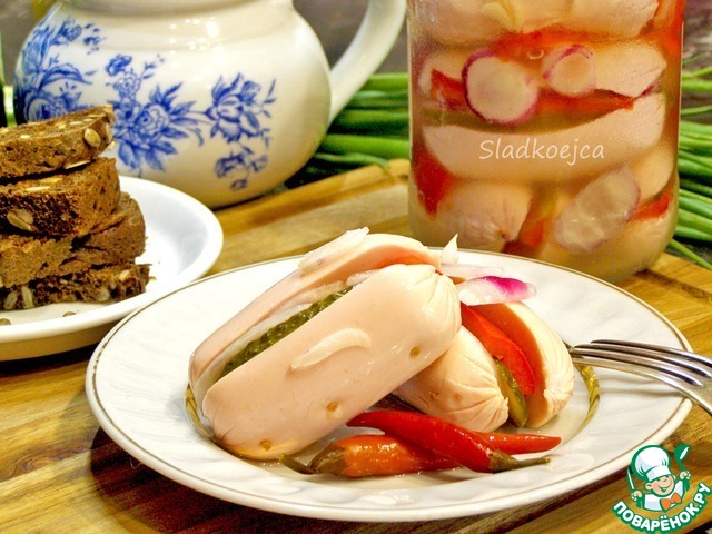 Изначально делала как закуску к пиву. Ничего сложного нет, просто надо запастись терпением. Пробу снимали на 6-й день, сосиски были умеренно промаринованными и слегка острыми. С острым перцем я поосторожничала, а зря. А еще очень вкусный лук и сладкий перец из маринада.