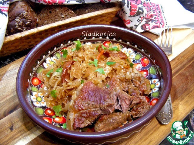 Восхитительный дуэт: мясо с гарниром из кислой капусты! Я по недосмотру добавила сладкое десертное вино. Переживала, что это испортит блюдо, но с гарниром из кислой капусты вышло замечательно. Готовила в мультиварке на режиме «тушение». Тушила долго, зато получилось очень мягкое мясо, хоть губами ешь. И еще бонусом много вкусной подливки! Отличный рецепт, рекомендую!