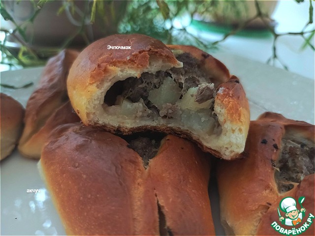 Скажу сразу, что получилось ооочень вкусно! Муки ушло меньше, 410 г. Получилось 14 штук. Верх смазывала молоком. Выпекала 35 минут при 180 градусах. Я не стала добавлять бульон (не было его у меня). Для фарша я использовала свиной фарш (300 г), добавив к нему 3 зубчика чеснока, немного укропа, одну луковицу и одну среднюю картофелину. Готовить просто, тесто подошло оочень быстро за 1 час, а результат радует: вкусно и сытно.
