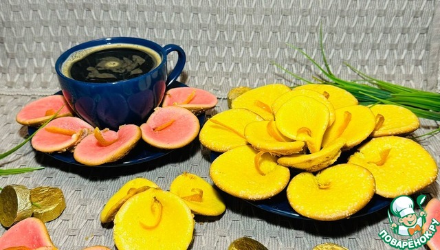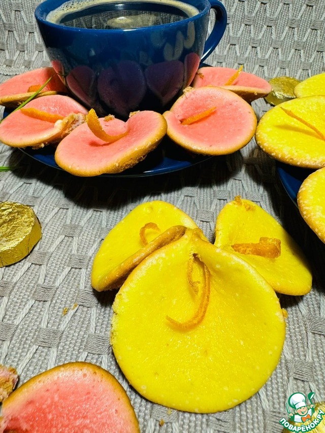 Всё строго по рецепту.Мои каллы жёлтенькие и розовенькие.вместо крема.апельсиновый цукатик.Бомбическое печенье