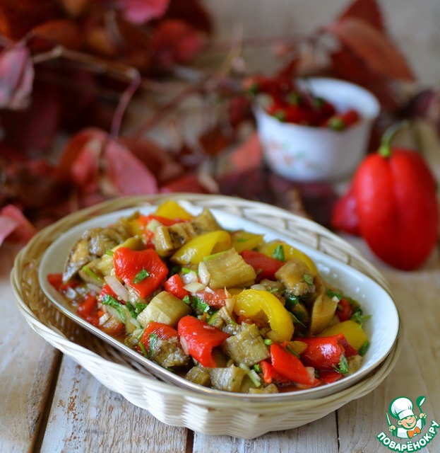 И ещё один салат из баклажанов с запечённым перцем от Люды Новосёловой. В своей любви к запечённым овощам я постоянна)).