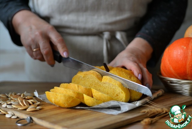 Ну и в финале "песня": Тыквенный хлеб. Готовила исключительно из-за фото, а получилось очень вкусно. Хотя я хлеб почти не ем. Делала на тыквенном пюре (варила тыкву), добавила Прованские травы и тмин. Одну булку отвезла детям, внукам. Хлеб сразу на стол положила и, пока "здоровались, обнимались", их два кота погрызли с разных сторон. Потом, конечно, обрезали. Внукам и невестке очень понравился хлебушек, хотя невестка не любит Прованские травы. И ещё. Я ем по кусочку в день, хлебу уже 2 недели, но его вкусовые качества не пострадали. Храню в холодильнике.