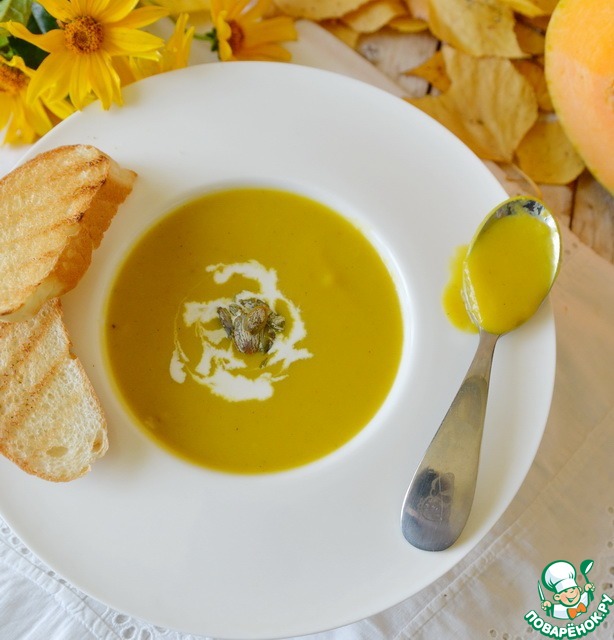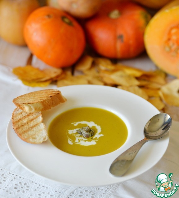 Соседка-однополчанка пригласила на огород, собрать остатки урожая. Там была и тыква. Я спрашиваю: "Сколько можно?" Она ответила: "Да, хоть всю". Вот это и называется: пустить козла в огород). Короче, сорвала 12 штук, выбирала маленькие и красивые, еле два пакета донесла, хорошо, до дома всего 100 м. И "Тут Остапа понесло". Начались тыквенные извращения. Суп - пюре: "Велюте из тыквы и батата". Увидела батат в магазине, никогда не ела, дорого, по 216 руб. Решила приготовить на курином бульоне, с куркумой, сливками. Сразу скажу: оригинально, вкусно, но не моё. Я осталась просто голодная и заела этот супчик целым вареным окорочком.