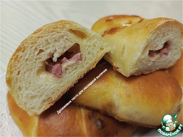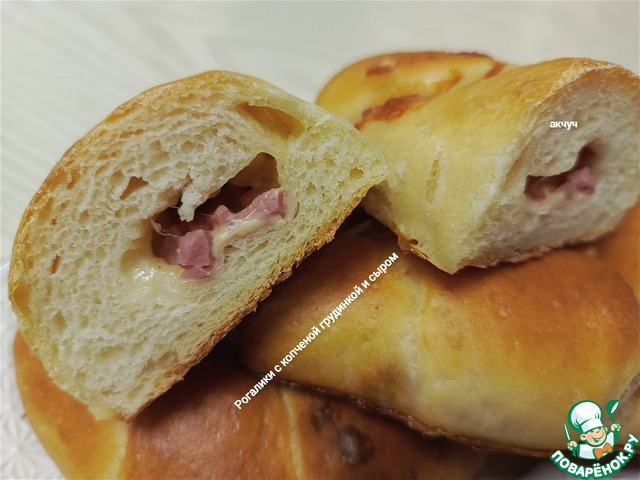 Рецепт теста брала по предложенной ссылке. Из половины теста приготовила данные рогалики. Вместо грудинки использовала сосиски, верх смазывала молоком, остальное по рецепту. Получились нежные, мягонькие рогалики такого не маленького размера. Вкуснющие!!!!!! Удержаться невозможно!!!!