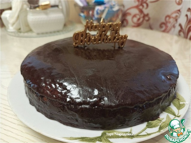 Как назло мой телефон взбунтовался и не смог передать всей красоты полученного результата. Готовила точно по рецепту. Стакан использовала 250 мл, форма диаметром 24 см. Выпекала 30 минут при 180 градусах. Получился замечательный вкусный торт. Глазурь шикарная, блестящая, гладкая. После ночного отдыха в холодильнике хорошо застыла, но при нарезке не ломалась и легко резалась. Семья осталась довольна.