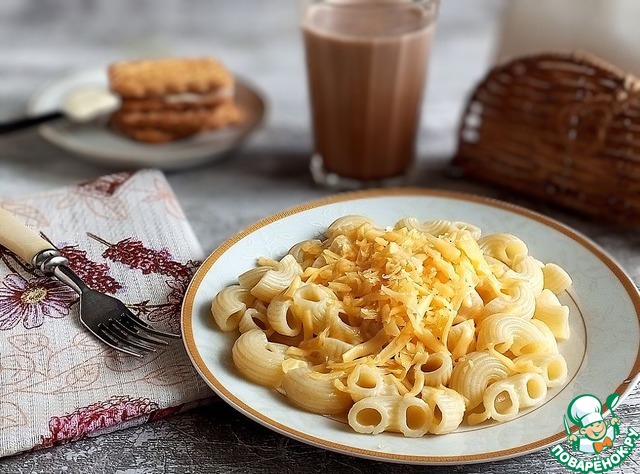 Завтрак я сделала из своего детства. Когда я была в пионерском лагере, я впервые попробовала макароны с сыром. С тех пор их очень нежно люблю и периодически готовлю. Бабуля потом мне их готовила, зная уже мою любовь к ним. Я - вообще "макаронная душа".