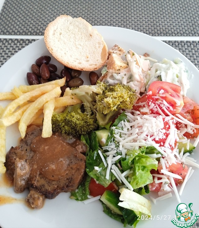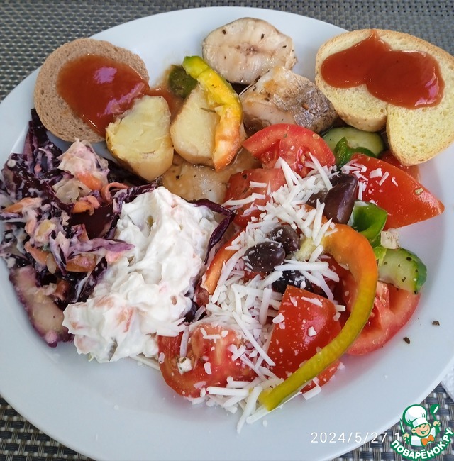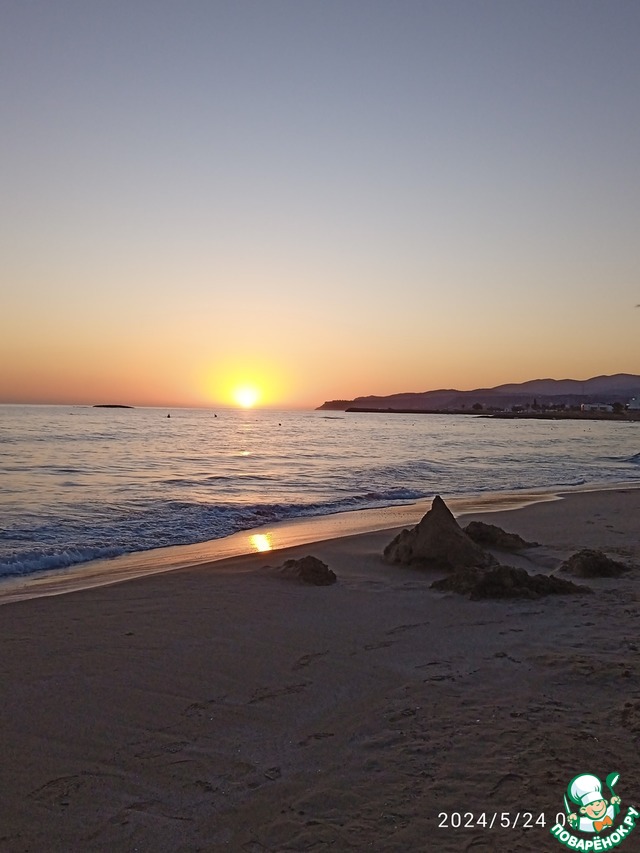 Специально поместила рядом две фотографии. Это стандартный набор продуктов хоть для завтрака, хоть для обеда или ужина. Всё так, как советуют диетологи - много овощей и кусочек рыбы или мяса. Меня удивило, что многие блюда подают совсем не солёными. Оказывается к ним просто надо добавить оливки, а не присолить, как сделало бы большинство из нас. На Крите вкусная выпечка. С языками у меня туго, практически никак, но слово калицунья я запомнила - это пирожки из тонкого теста с различными начинками, самая распространённая творожная с зеленью. Греческий йогурт и сыр - обязательная составляющая каждого приёма пищи. А вот супы здесь не едят. Зато пьют каждый день вино, но, как древние греки, разводят его водой. Мы не разводили))