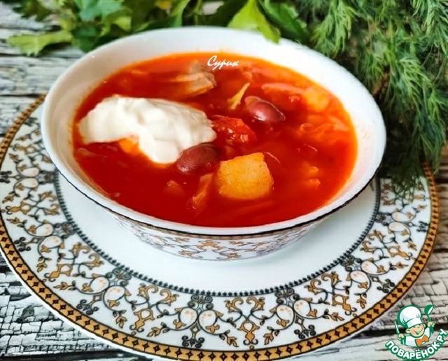Борщ получился очень вкусный! Готовила с индейкой (голень), тоже добавила овощи при варке. Свеклу в бульоне варила первый раз. Обычно отвариваю её отдельно (не очищаю). Бульон сварила вечером и оставила до утра. На следующий день быстро сварила борщ. Овощи почистила, нарезала, необходимые обжарила. Добавила и томатную пасту, и помидор нарезанный. А вот огурец соленый со сметаной не решилась добавить. Сметану потом, но уже в готовый борщ и в тарелку. Фасоль я взяла консервированную в с/с. С сырой свеклой манипуляции не проводила, т.к. я ее не добавляла. Только добавила вареную натертую и сваренную в бульоне. Поэтому мой борщ сварился быстро. Борщ нам понравился!