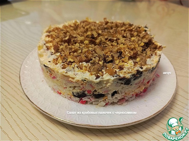 Я люблю блюда с добавлением чернослива в отличие от моей семьи. Готовила точно по рецепту. Кольцо использовала 16 см в диаметре. Получилось очень вкусно. Для себя решила, что в первый слой добавлю больше майонеза, чтобы крабовые палочки не крошились.