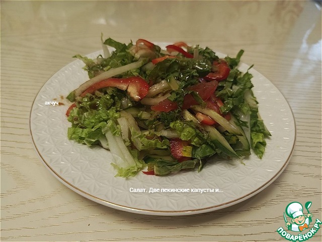 Использовала пекинскую капусту и сухой укроп, остальное по рецепту. От себя добавила еще бальзамический уксус. Получился вкусный витаминный салат. Так бы ела и ела.