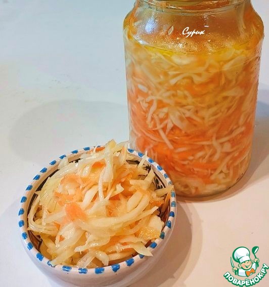 Замечательная капуста получилась! Очень вкусная, хрустящая, ароматная! У меня всё по рецепту. Уксус яблочный добавила. Очень понравилась!