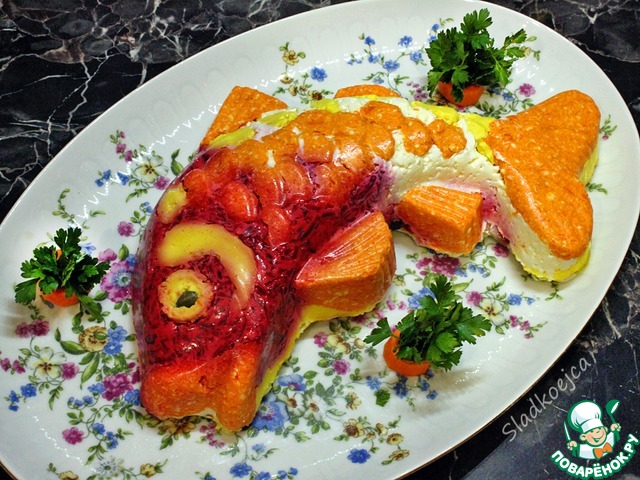 Уже подбираю рецепты к НГ, и встретился мне такой оригинальный вариант любимого салата. А я как раз купила новую форму в виде рыбки