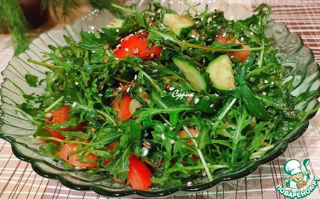 Очень вкусный и ароматный овощной салат! Листья салата заменила руколой. Замечательная заправка.