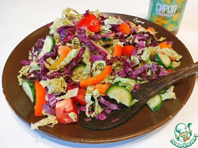 Увидела в магазине капусту пекинскую фиолетовую (именно так и было написано на упаковке - фиолетовая). Вспомнила про рецепт. И… приготовила! Очень вкусный салат. Красивый и необычный на вид. Заправка великолепная! Добавила сироп топинамбура,