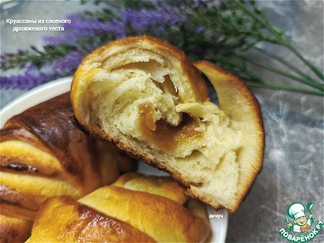 Вот смотрю, у других поварят все ровненько, красивенько, у меня же не получается слоеное тесто. Оно норовит куда-то съехать, сжаться. Но уж решила печь. Муки ушло чуть меньше (485 г.), начинкой послужило яблочное повидло. Я делила сначала тесто на 11 частей, из них после получилось две лепешки, которые потом раскатывала и делила на 8 секторов. Выпекала 20 минут при 180 градусах. Первая партия зарумянилась, но мы любим такую выпечку. Второй противень вышел чуть светлее. В целом, получились вкусные булочки. Сладкие, мягкие.