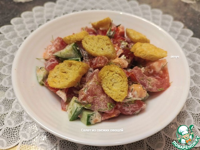 Такой салат вкусен и востребован в любое время года. А сухарики добавили новую вкусовую нотку знакомому салату.