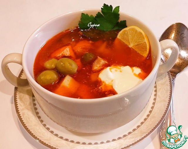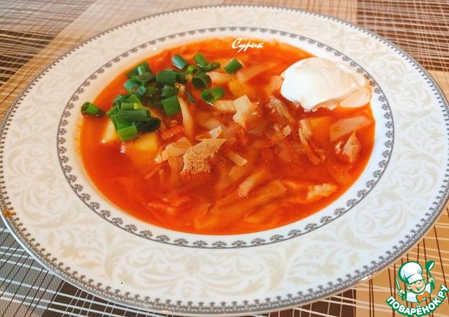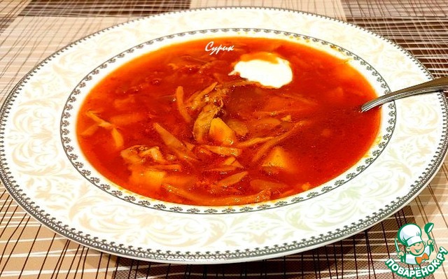Отличный борщ! Варила с индейкой. Капуста квашенная своя. Как же вкусно получилось! Свеклу отварила отдельно, а потом натерла. Пропорции, как и всегда при варке супов, свои.