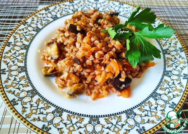 Очень вкусная гречка получилась! Гарнир или самостоятельное блюдо. Но я с баклажанами манипуляции такие не проводила, как в рецепте. Нарезала кубиками и добавила для обжарки в лук с морковкой. Остальное всё по рецепту.