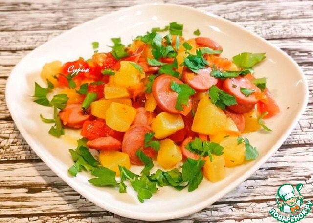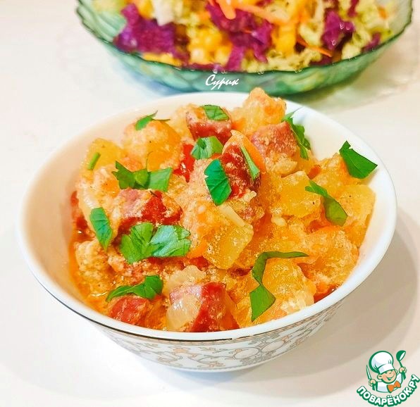 Замечательная капуста получилась. У меня с сосисками. Кетчуп заменила томатной пастой. Вкусно! Очень!