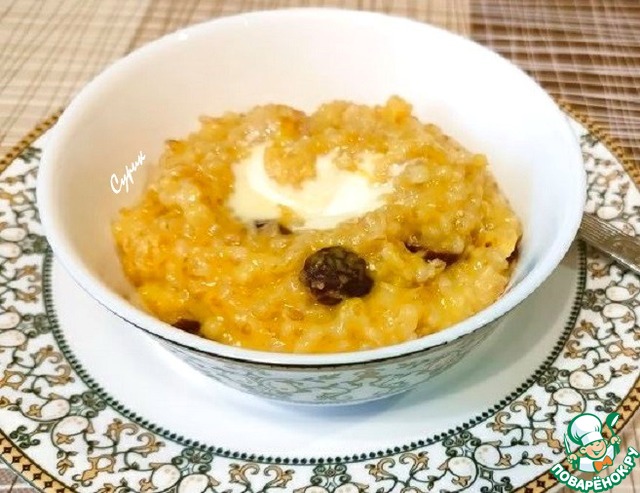Очень и очень вкусная каша получилась! Честно сказать – даже и не ожидала! Результат превосходный! Вот такая солнечная, яркая каша! Добавила ещё чуть-чуть изюма. Вкусно!!! Тыквенное пюре у меня уже было в холодильнике. Поэтому очень быстро приготовила на завтрак эту замечательную кашу!