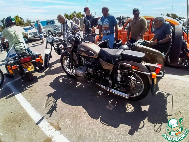 Хозяин мотоцикла стоит справа.Мотоцикл выглядит как только с завода.