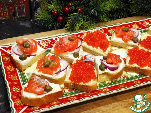 Начну с закусок, холодных и горячих. Кроме разных нарезок, сырных и мясных (которые не фотографировала), я сделала бутерброды с икрой и соленой рыбкой. Бутерброды с рыбой готовлю второй год подряд, скажу по секрету, что нам они нравятся даже больше, чем с красной икрой.