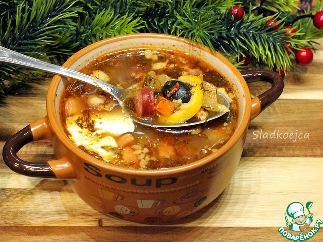 Солянку мы любим, с удовольствием едим и 31-го на ужин, а уж первого января и вовсе вещь незаменимая. По этому рецепту получилась очень вкусная солянка, только я варила без картошки. При подаче, в тарелку обязательно положить ложечку сметанки…