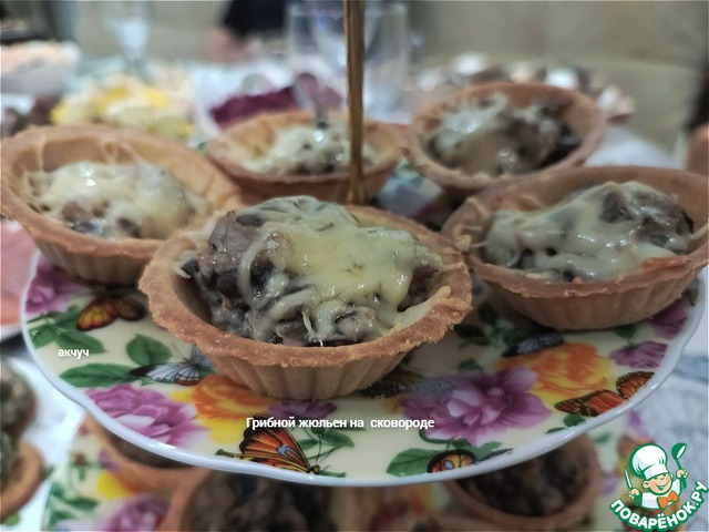 Мы любим жюльен, поэтому на праздник традиционно готовила сразу по нескольким рецептам. Шампиньоны брала свежие. Не поняла, что нужно использовать: в рецепте написано молоко, а в тексте сливки. Брала сливки. Получилось ожидаемо вкусно. На праздничный стол подавала в тарталетках порционно.