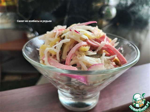 Я не стала ждать праздничных выходных, приготовила на ужин. Вместо черной редьки использовала дайкон, он не такой ядреный. Получился вкусный сочный салат. Соль и сахар не добавляла, меня и так все устроило.