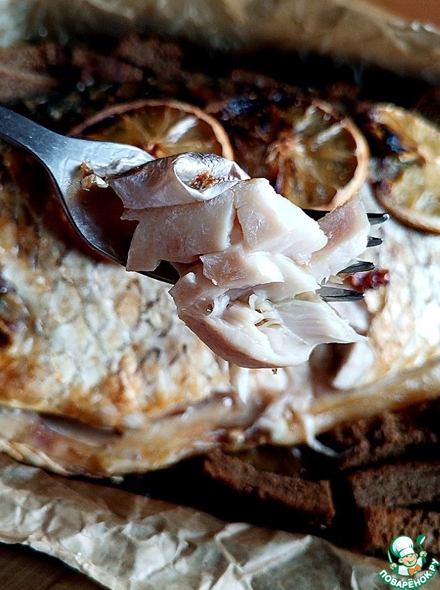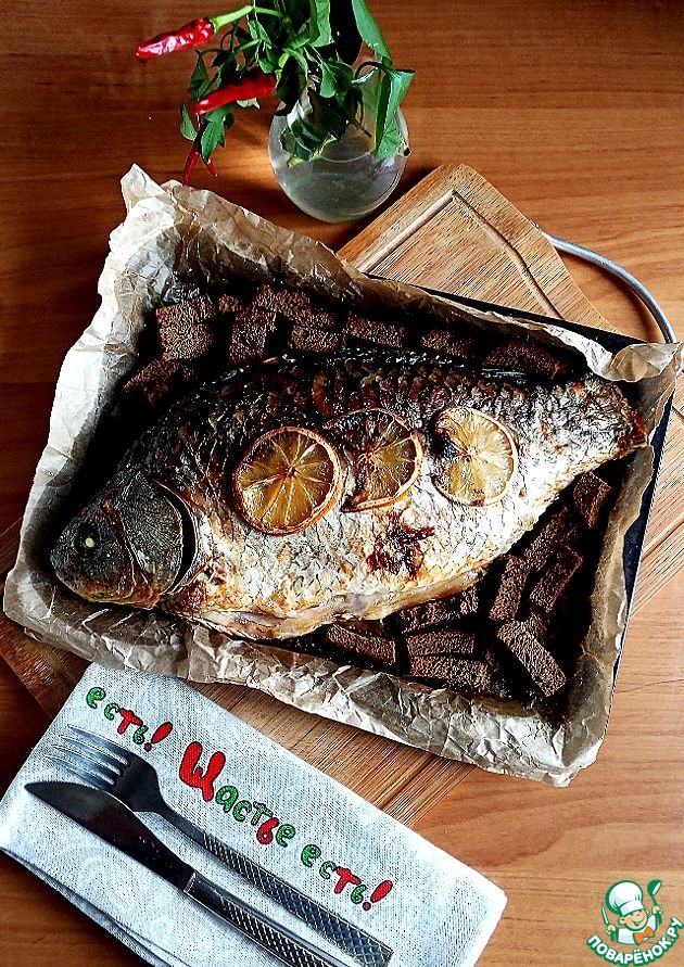 На обед я не ела первое. Сегодня я запекла в духовке сазана местного на 1,3 кг. Я - любитель рыбы любой. Сазана почистила, убрала плавники, жабры. Выложила на пекарскую промасленную бумагу, присолила её морской крупной солью. Поверх - сазан. В пузико положила 2 дольки лимона и тоже солью присыпала немного. Сверху помазала рыбу кисточкой с маслом, присолила немного и выложила 3 дольки лимона. Запекала рыбу 1 час при Т-180 С в духовом шкафчике. За 10 минут до готовности я выложила кусочки-брусочки Бородинского хлеба в свободные места на протвине. У рыбы жирок вытопился и сухарики получились "умопомрачительные". Я так часто делаю. Речная рыба всё же костлявая и я её заедаю этими сухарями, а - то вдруг косточка попадётся. Я рыбу речную ем подолгу - с чувством, с толком, с расстановкой (особенно голову).