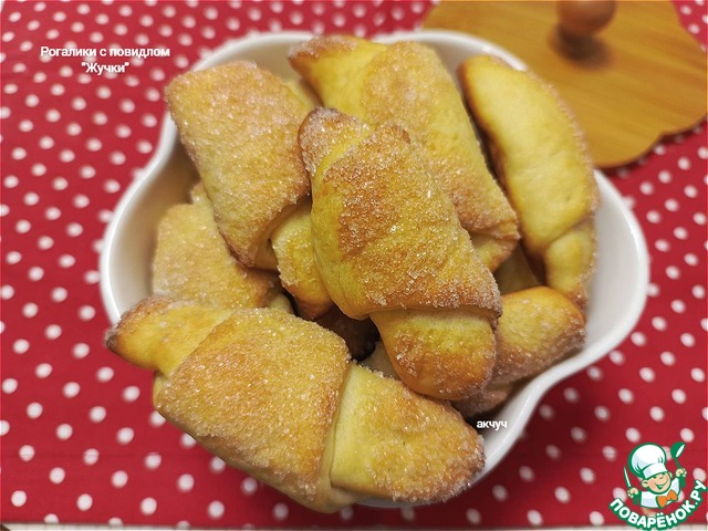 Давненько не пекла дрожжевую выпечку. Готовила половину нормы. Яиц положила 2 шт., муки ушло 335 г и дрожжи использовала свежие 12 г. Тесто замечательное получилось, нежное, живое. Налепила 13 штук рогаликов (они у меня лучше получаются). Масло при формовке не использовала, верх перед выпечкой смазала сливками. Выпекала 20 минут при 180 градусах. Получилось очень вкусно. Семья осталась довольна!