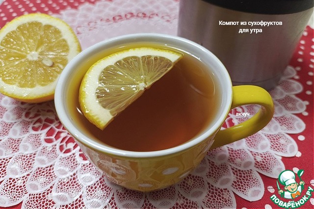 В детском саду давали компот из сухофруктов. Решила вспомнить детство. Заинтересовал необычный способ приготовления и добавление лимона. Какой же вкусный получился компотик!!! Радовалась, как ребенок. А лимон придал новую вкусовую изюминку. Буду обязательно повторять, но увеличив норму.