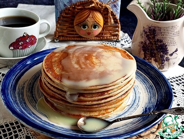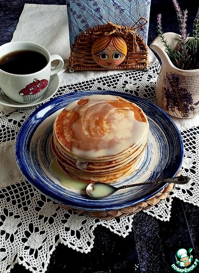 Мой завтрак был блинный. Мне нужно было использовать творог и я добавила его в блинное тесто. Тесто делала в блендере. Это у меня были ванильно-творожные блинчики на завтрак. Блинчики не большие в D~10-12 см. Ела я их со сгущёнкой.