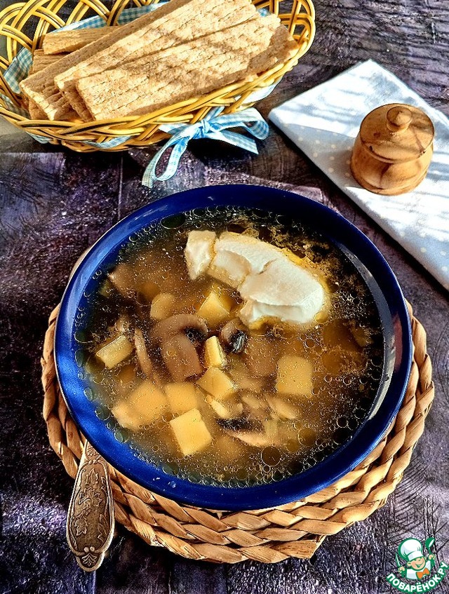 Блинчики всё-таки сытная и калорийная еда и я на обед решила приготовить суп из шампиньонов. Я отвариваю всегда куриные голени и потом их использую для салатов и вторых блюд для себя. Бульон остаётся. Варю на нём разные супчики. Вот и этот суп сварила на курином бульоне.