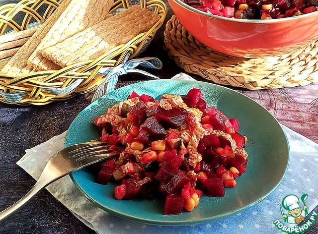 Часа через 2 я приготовила себе овощной свекольный салат. Это перед обедом. Свёкла отварная+кукуруза консервированная+пекинская капуста+огурец свежий+красный крымский лук. Сделала пикантную заправку к нему: соевый соус+горчица+зубчик чеснока давленный+лимонный сок+мёд+масло нерафинированное подсолнечное. Делала на вкус, добавляя ингредиенты прямо в салатник, куда потом выложила основные ингредиенты. Сначала в заправку выложила мелко порезанный лук, чтобы он промариновался в заправке, пока я режу овощи. Солила салат, уже перемешав.
