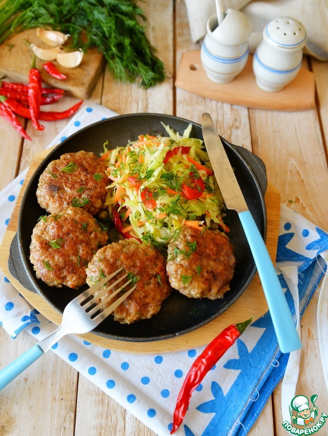 Котлеты "Рецепт-сомнение". https://www.povarenok.ru/recipes/show/23795/ Оригинальное название. В общем, ничего нового, только, обычно вместо сливок - молоко. Ну и на гарнир - овощной салат.