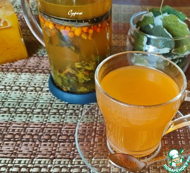 Очень и очень вкусный напиток! С большим удовольствием приготовила и выпила. Облепиха из заморозки, листья малины сушеные. С медом очень вкусно!