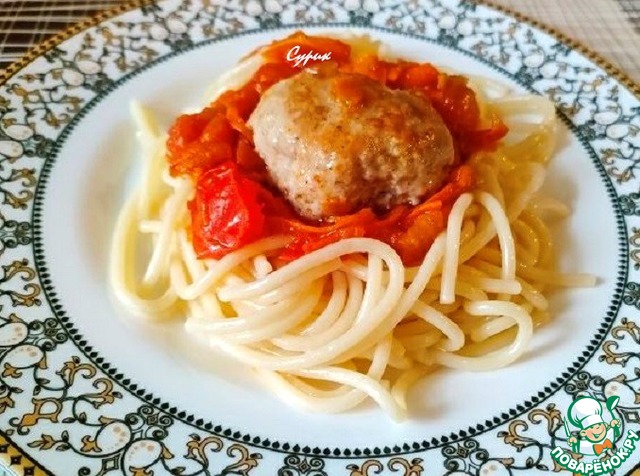 Конечно, это вкусно! Но… я немного изменила рецепт под себя. Макароны – спагетти, тефтели приготовила отдельно – потушила в сотейнике и овощи (подливу) приготовила отдельно. Всё сформировала уже в тарелке, в духовку не ставила, т.к. всё уже было в готовом виде.