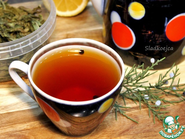 Приятный, душистый, освежающий чай. Мяту взяла сушеную, а можжевельник был свой, всегда под рукой.